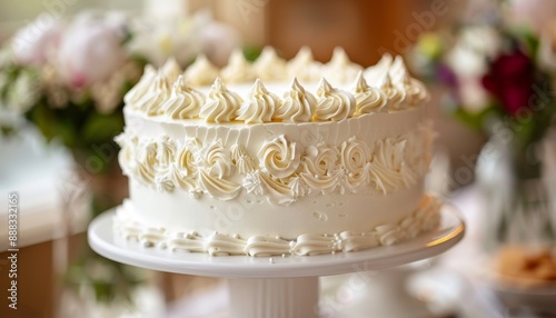 Fototapeta premium Gorgeous white cake with creamy topping on stand