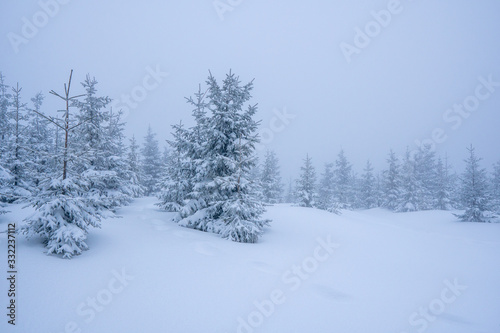Naklejka premium Gorgeous winter landscape in the mountains at snowy visibility with fog in the background, Czech Lysa Mountain