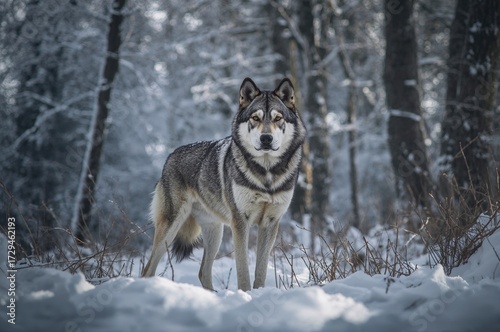Fototapeta premium Gorgeous Wolfdog Amidst Icy Woods