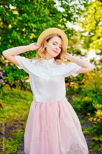 © smmartynenko, Obraz premium Gorgeous young woman in hat posing in a blooming garden. Beautiful girl dressed in pink skirt and white blouse. Sensual woman with perfect skin and with natural makeup. fashion and style concept.