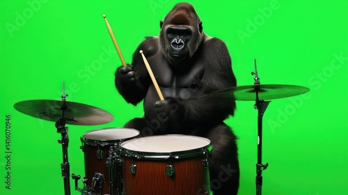 © Randu, Fototapeta premium Gorilla drummer studio green screen background
