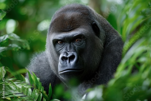 © YouraPechkin, Obraz premium Gorilla gazes thoughtfully at the lush greenery in the jungle during daylight hours
