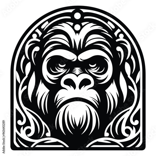 Fototapeta premium gorilla monkey with art nouveau decoration, stencil logo, black and white...