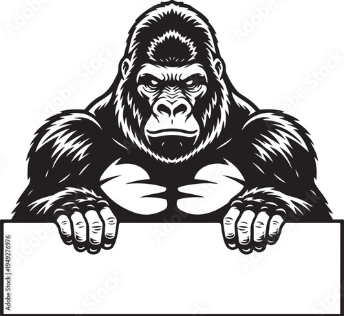© ELAnani, Fototapeta premium Gorilla peeking over a blank sign with a serious expression