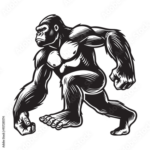 © Shineoxstock, Obraz premium Gorilla Silhouette - Funny Gorilla Gesture, Muscle Gorilla Clipart, A Knuckle Walk Gorilla Illustration in black and white
