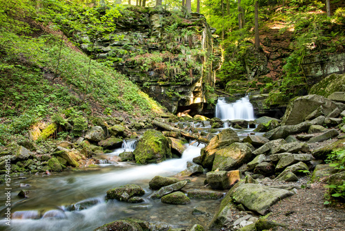 © sly10000, Naklejka premium Górski wodospad w leśnej scenerii.