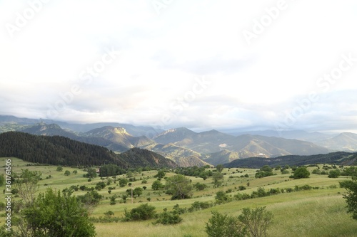 Fototapeta premium Górskie zielone wzgórze widok na dolinę. Krajobraz górskiej wioski. Savsat /...