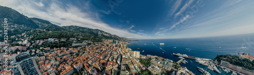 © Vivid Cafe, Fototapeta premium Góry w Monako Riwiera miejska Monte-Carlo Drone lato zdjęcie Panorama drona z wirtualnej rzeczywistości Air 360 vr