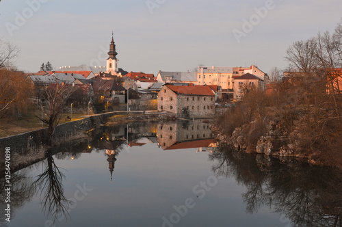 © Ivica, Naklejka premium Gospic town panorama with river Novcica reflection