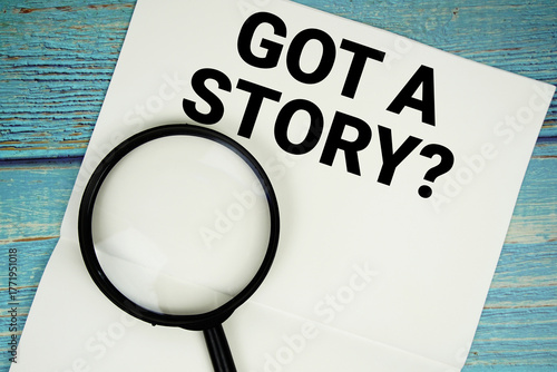 © may1985, Naklejka premium Got A Story? text written on notepad with magnifying glass flat lay on wooden background