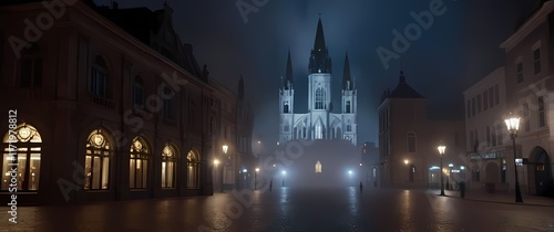Fototapeta premium Gothic architecture towering over town squares illuminated at night