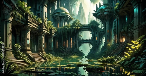 Fototapeta premium gothic baroque city palace in woodland forest wetlands. fantasy overgrowth cyberpunk town house castle in marsh swamp river pond lake water.