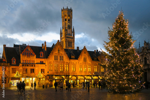 © jonas, Obraz premium Gothic burg place with city hall and basilica at christmas with decorations at night, in Bruges, Belgium