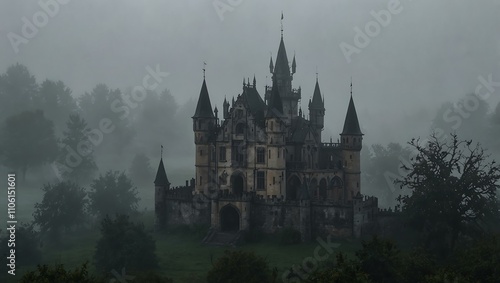 Fototapeta premium Gothic castle enveloped in dense fog.