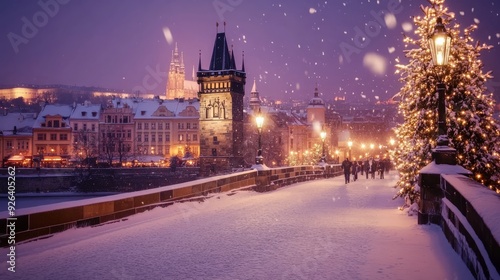 © Togrul, Fototapeta premium Gothic Castle in Snowy Nighttime Prague