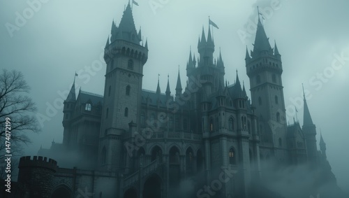 Fototapeta premium Gothic Castle Silhouette Amidst Fog and Stormy Sky in a Mystical Atmosphere