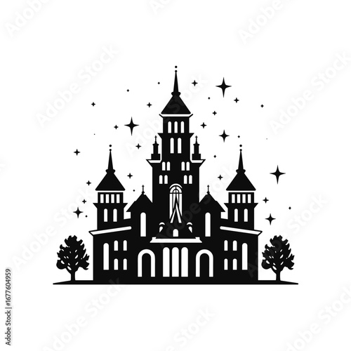 Fototapeta premium Gothic castle silhouette with stars and trees