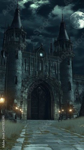 © Nicolai, Fototapeta premium gothic castle with turrets and dark stone walls, set against an ominous sky