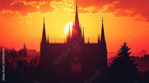 © Thiago, Naklejka premium Gothic cathedral at fiery sunset. Gothic Cathedral Shadows. Illustration