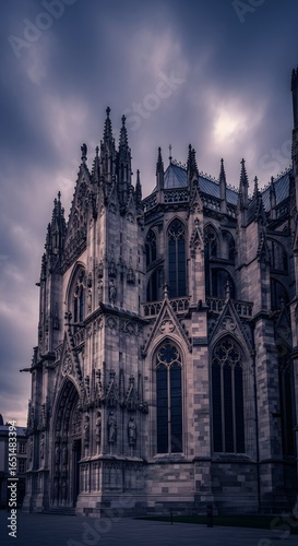 © Abderrazzak, Fototapeta premium Gothic cathedral at twilight, moody clouds and detailed stonework