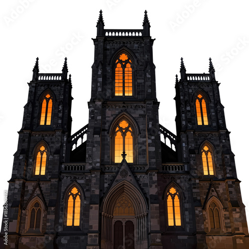 © ViVn, Fototapeta premium Gothic cathedral facade with illuminated stained glass windows