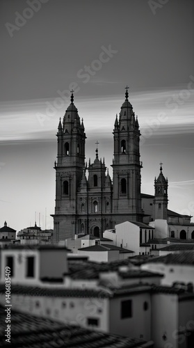Fototapeta premium Gothic Cathedral Rising Above City Rooftops – Black and White Architectural...
