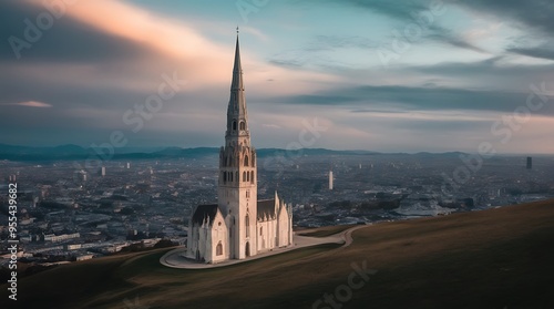 © Shahabuddin, Obraz premium Gothic Cathedral Standing Majestically on a Hill Overlooking a Vast Cityscape at Dusk