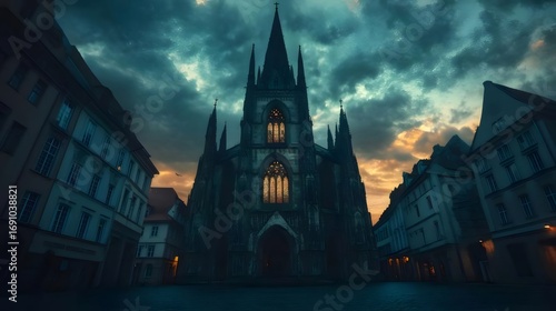 © Kagezt2, Fototapeta premium Gothic Cathedral Under Dark Sky with Sunset in City Street