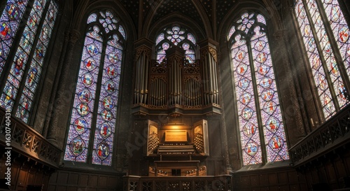 © yaka_std, Obraz premium Gothic church interior with stained glass and organ