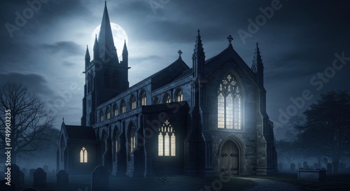 © Lunar Muse, Fototapeta premium Gothic Church Under Moonlight: Eerie Night Scene with Cemetery and Towering Spire