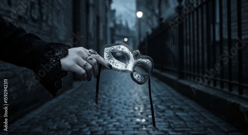 Obraz premium Gothic Female Hand Holding White Venetian Mask in Dark Alley