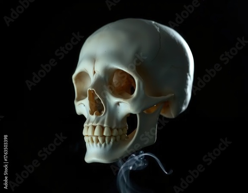 © IhsanKL, Obraz premium Gothic Human Skull Mockup with Dramatic Lighting on Deep Black Studio Background