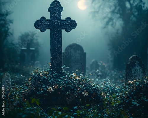 Naklejka premium Gothic Iron Cross Shrouded in Ivy Under Eerie Moonlight in Old Cemetery Landscape