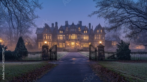 © Lorraine, Obraz premium Gothic mansion surrounded by mist, broken windows, creaking iron gates, dead trees lining the pathway, pale moonlight illuminating the rooftop