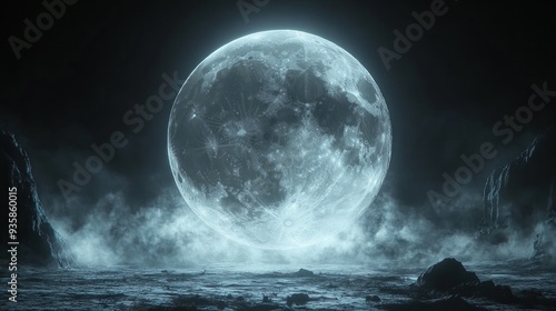 © pisan, Fototapeta premium Gothic Moon Illuminating Eerie Landscape, Dark and Mysterious Night Sky with Full Moon Shining Over a Mystical, Foggy, and Spooky Scene, Perfect for Halloween, Horror, or Fantasy Art