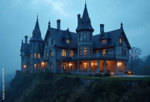 © Yaroslava, Fototapeta premium Gothic Revival Mansion Spires Pointed Arches Dramatic Elegance Medieval Charm