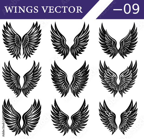 © stockmarket, Fototapeta premium Gothic Style Black Feathered Wings Vector – Silhouettes of Angel and Devil Wings for Tattoo Art, Fantasy Poster Illustration, and Halloween Design Projects in Clean Vector Format.