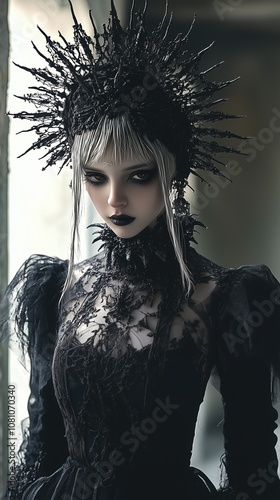 © Goodman, Obraz premium Gothic woman in intricate black headdress portrait
