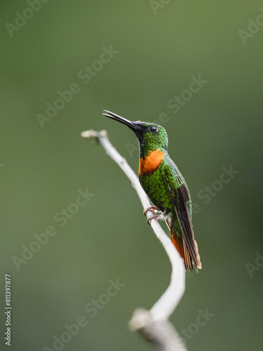 © FotoRequest, Fototapeta premium Gould's Jewelfront Hummingbird on a stick against green background