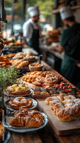 Fototapeta premium Gourmet breakfast spread on a rustic wooden table
