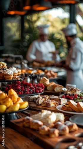 Fototapeta premium Gourmet breakfast spread on a rustic wooden table