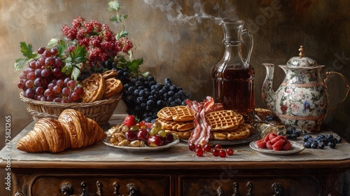 Fototapeta premium Gourmet breakfast still life: croissants, waffles, fruit and syrup. Great for...