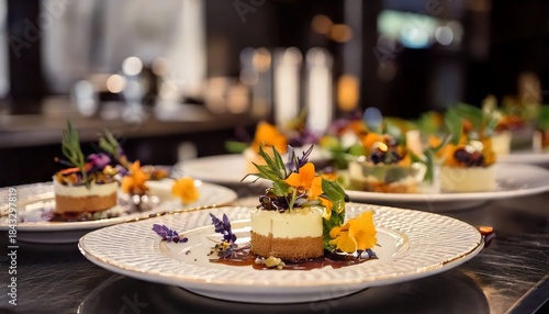 © kinkin, Fototapeta premium Gourmet dessert creations presented on elegant white plates adorned with fresh edible flowers and herbs