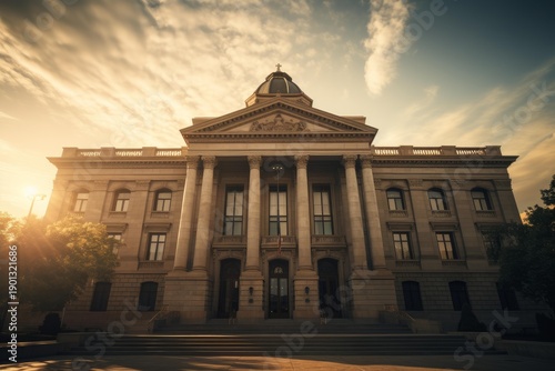 © nsit0108, Naklejka premium Government building featuring columns and a dome under a dramatic cloudy sky at sunset