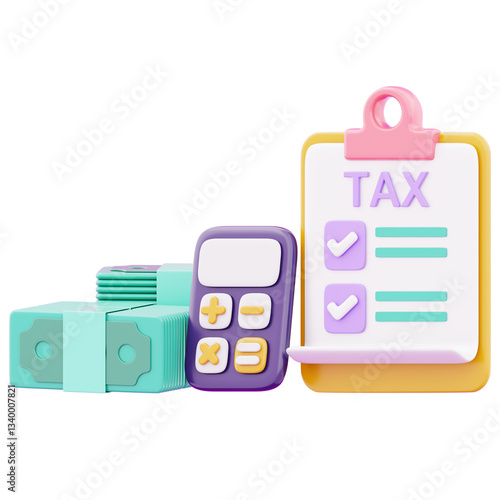 Fototapeta premium Government tax document with calculator and banknote representing business payment invoice processing icon. 3d payment for business illustration image