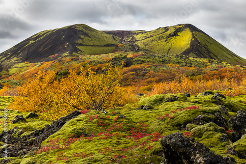Fototapeta premium Grábrók Crater Landscape in Autumn/Fall with Lava Field and Autumnal Colored...