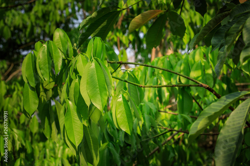 © Frozen Action, Obraz premium Grüne Blätter vom Kautschuk Baum auf einer Plantage, Hevea brasiliensis