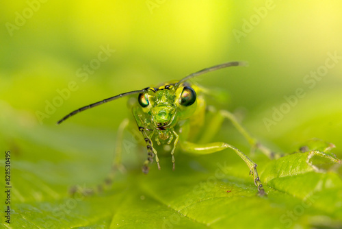 Fototapeta premium Grüne Blattwespe auf einem grünen Blatt