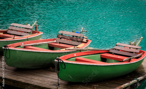 Obraz premium Grüne Ruderboote am Walchensee, Bayern