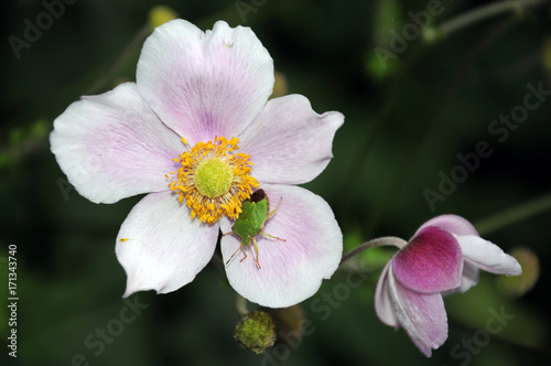 Fototapeta premium grüne Stinkwanze auf Herbstanemonenblüte